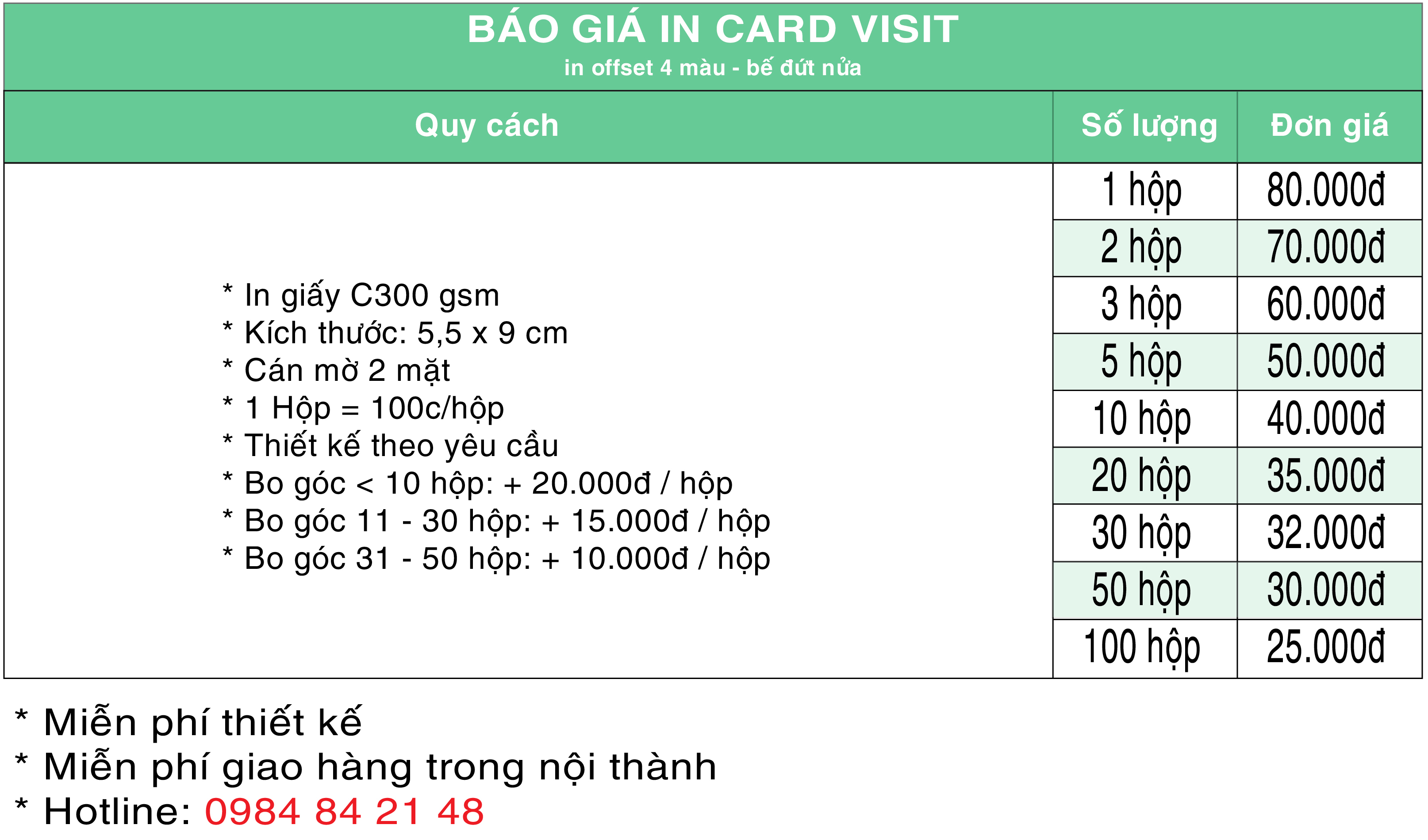 Khách hàng đặt in dưới 3 hộp card/nội dung thanh toán thêm 50.000 phí thiết kế